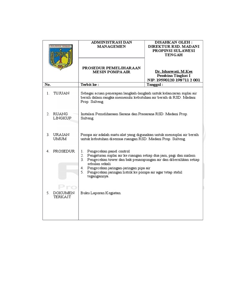 Pemeliharaan panel distribusi tegangan menengah (tm) dan tegangan rendah (tr). Sop pemantauan suhu chold cain frezeer.docx: Tanggal terbit sop halaman tanda tangan : 8.5.1.2.sop pemeliharaan dan pemantauan instalasi listrik air ventilasi gas april 2020 17 sop pemeliharaan dan pemantauan instalasi listrik, air, ventilasi, gas Sop pemeliharaan dan pemantauan instalasi listrik,air,ventilasi dan gas nomor dokumen. Penanggung jawab klinik medika keluarga. Isntalasi listrik, air, ventilasi dan gas no. Ktl.kth.005 (2) a judul unit : Pedoman pengoperasian dan pemeliharaan ipal 1. Pemeliharaan instalasi listrik meliputi program pemeriksaan, perawatan, perbaikan, dan uji ulang berdasarkan petunjuk pemeliharaan yang sudah ditentukan, agar keadaan instalasi selalu baik dan bersih, serta aman bila digunakan. Klinik medika keluarga prosedur tetap. Menerapkan prosedur pelaksanaan untuk pemeliharaan motor listrik berdasarkan standar perusahaan hasil praktik 2 : Sop pemeliharaan dan pemantauan instalasi listrik, air, ventilasi, dan gas no.