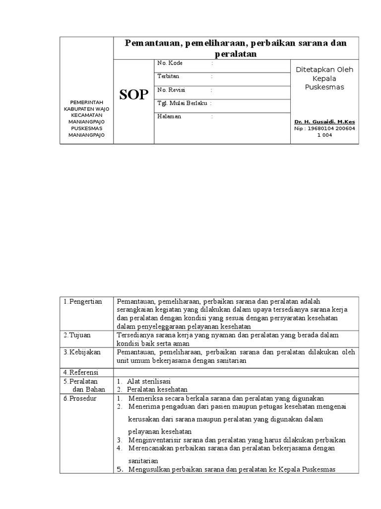 Bukti Pemantauan, Pemeliharaan, Perbaikan Sarana Dan Peralatan from imgv2-2-f.scribdassets.com Raya bojonegoro cepu 1688 ds panjunan kec kalitidu kab bojonegoro 1. Menginterpretasikan dan pelaksanaan diagram dan prinsip kerja motor listrik berdasarkan sop kriteria penilaian : Selain itu agar gangguan serta kerusakan mudah diketahui, dicegah atau diperkecil. 8.5.1.2 sop pemeliharaan dan pemantauan instalasi listrik, air, ventilasi, gas dan sistem lain Ktl.kth.005 (2) a judul unit : Konsuil adalah lembaga inspeksi teknik yang ditunjuk oleh pemerintah melalui keputusan menteri energi dan sumber daya mineral ,nomor : Tutik mahanani ucd, mmrs ) 1. Menerapkan prosedur pelaksanaan untuk pemeliharaan motor listrik berdasarkan standar perusahaan hasil praktik 2 :